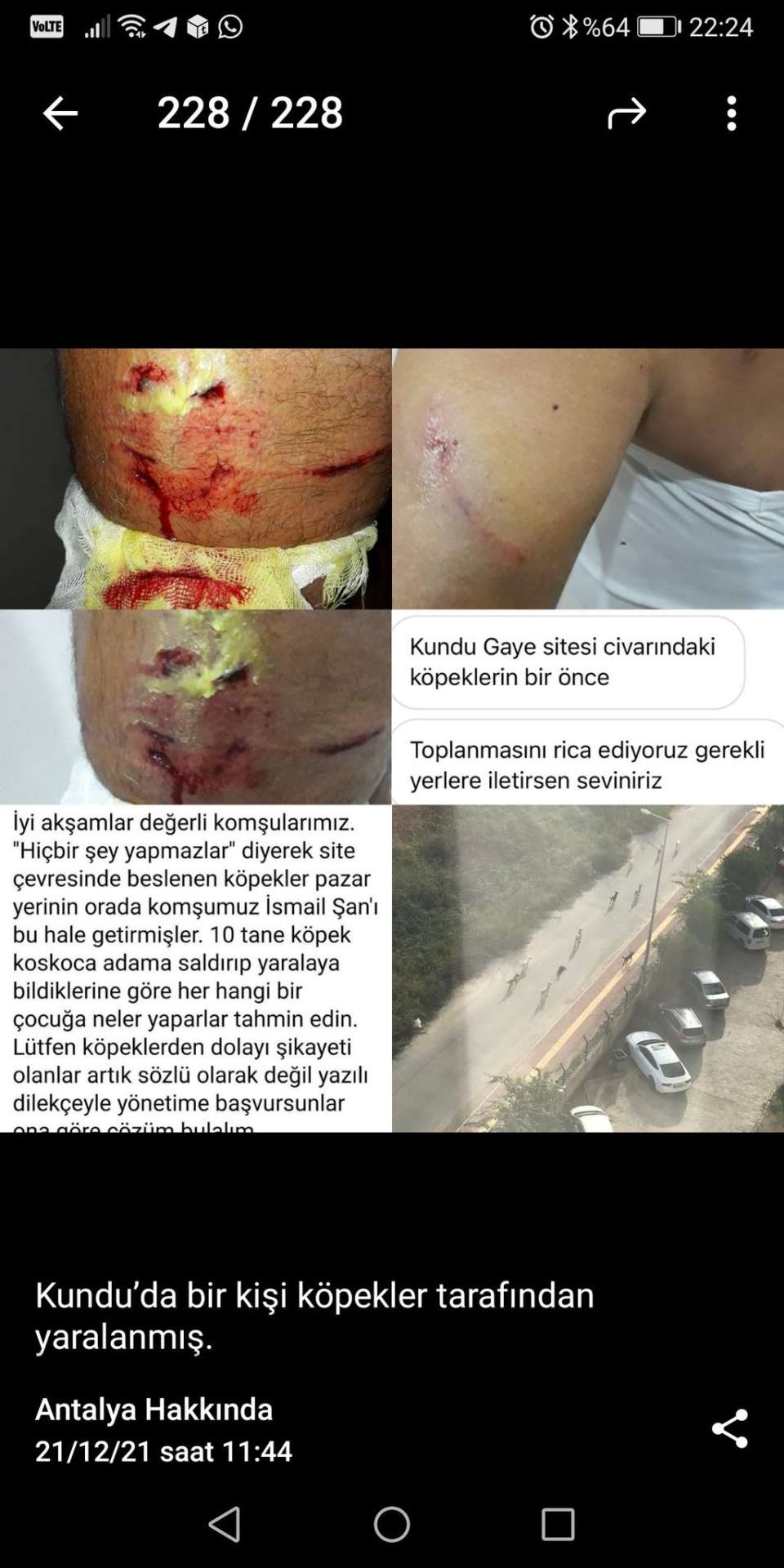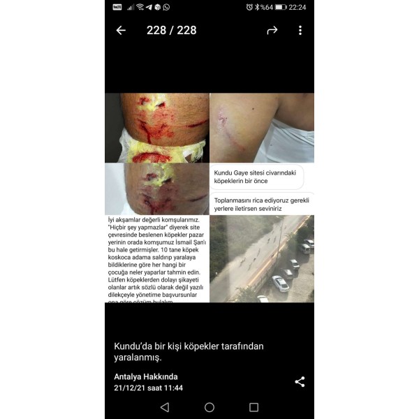 Antalya'da sitede beslenen başıboş köpekler dehşet saçtı! Aksu Kemerağzı'nda bir sitede yaşayan İsmail Ş. (60), yürüyüş yaptığı esnada başıboş köpek sürsüsünün saldırısı sonucu yaralandı İsmail Ş., tüm çabasına rağmen köpeklerin saldırısını engelleyemedi. Yere düşen ve köpeklerin ısırıklarına maruz kalan İsmail Ş.’yi çevre esnafı kurtardı. Kolundan ve ayağından yaralanan İ.Ş., hastanede tedavi oldu. Kaynak : https://x.com/KopekSorunu/status/1473381806418313218 https://www.mygazete.com/antalyada-yuruyus-yaparken-kopekler-saldirdi/496879/
