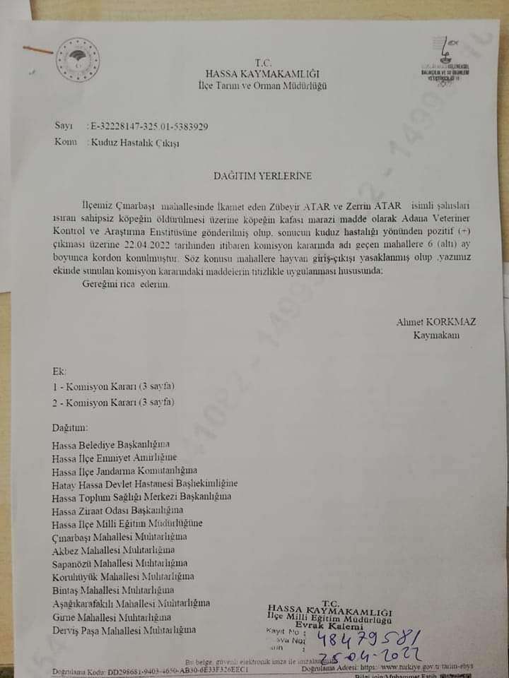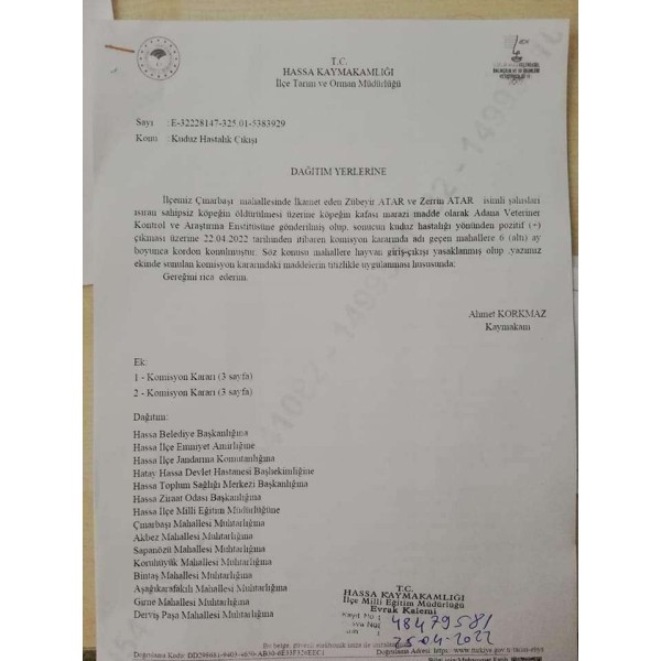 Hassa’da 7 Mahalle Karantinaya Alındı2 kişiyi ısıran sokak köpeği KUDUZ çıktı! İlimiz Hassa ilçesinde iki kişiyi ısırdığı belirlenen sokak köpeğinin, öldürülerek, kafatasının araştırma enstitüsüne gönderilmesi ve kuduz olduğunun tespiti üzerine, ilçede 7 mahalle kordon altına ayındı, hayvan giriş-çıkışları yasaklandı. Hassa Kaymakamı Ahmet Korkmaz, hafta başında yaşanan gelişme ve sonrası yaşananlarla ilgili bir genelge yayınladı ve ilçede 7 mahallede kordon altına alınma uygulamasının devreye girdiğini, ayrıca hayvan giriş-çıkışlarının da 6 ay süreyle yasaklandığını bildirdi. Hassa ilçesinde kordon altına alınan, hayvan giriş-çıkışı yasaklanan 7 mahalle şunlar: Çınarbaşı, Akbez, Sapanözü, Koruhüyük, Bintaş, Aşağıkarafakılı Girne, Derviş Paşa Mahallesi Muhtarlığı. Hassa Kaymakamlığı’nın ilgili kuruluşlara da gönderilen resmi yazısı ise şöyle: “İlçemiz Çınarbaşı Mahallesi’nde ikamet Zübeyir Atar ve Zerrin Atar isimli şahısları ısıran sahipsiz köpeğin öldürülmesi üzerine, köpeğin kafası, marazı madde olarak Adana Veteriner Kontrol ve Araştırma Enstitüsü’ne gönderilmiş olup, sonucun, kuduz hastalığı yönünde pozitif (+) çıkması üzerine, 22.04.2022 tarihinden itibaren, komisyon kararında adı geçen mahallelere 6 (altı) ay boyunca kordon konulmuştur. Söz konusu mahallelere hayvan giriş-çıkışı yasaklanmış olup, yazımız ekinde sunulan komisyon kararındaki maddelerin titizlikle uygulanması hususunda gereğini rica ederim.” Kaynak : https://x.com/KopekSorunu/status/1519963065445457922 https://antakyagazetesi.com/hassada-7-mahalle-karantinaya-alindi/ |