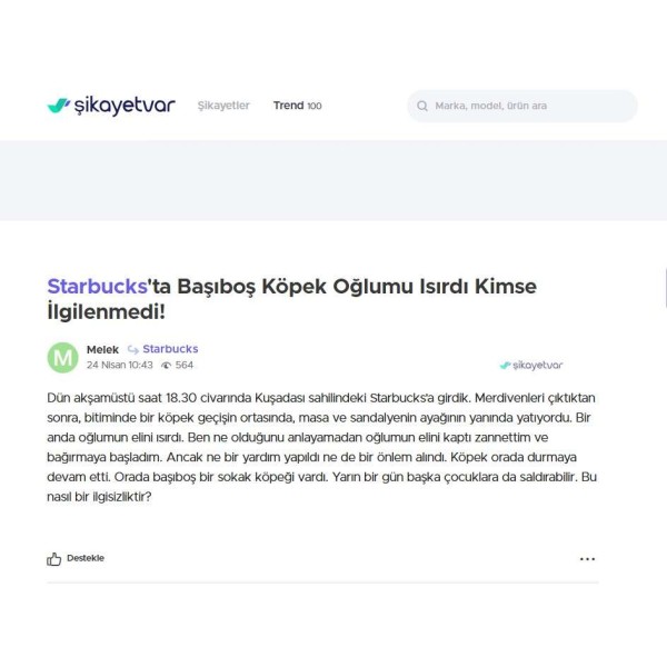 Saat 18.30 civarında Kuşadası sahilindeki Starbucks'a girdik. Merdivenleri çıktıktan sonra, bitiminde bir köpek geçişin ortasında, masa ve sandalyenin ayağının yanında yatıyordu. Bir anda oğlumun elini ısırdı. Ben ne olduğunu anlayamadan oğlumun elini kaptı zannettim ve bağırmaya başladım. Ancak ne bir yardım yapıldı ne de bir önlem alındı. Köpek orada durmaya devam etti. Orada başıboş bir sokak köpeği vardı. Yarın bir gün başka çocuklara da saldırabilir. Bu nasıl bir ilgisizliktir? Kaynak : https://www.sikayetvar.com/starbucks/starbucksta-basibos-kopek-oglumu-isirdi-kimse-ilgilenmedi |